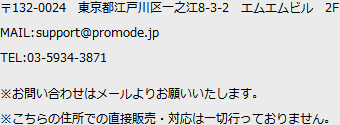 ※Yahoo!等のフリーメールをご使用の場合、こちらからの返信メールが迷惑フォルダに格納されてしまう場合がございます。万が一、3営業日が経過してもこちらからの返信メールが届かない場合は、お手数ですが迷惑フォルダをご確認下さいますよう、お願いいたします。 |
